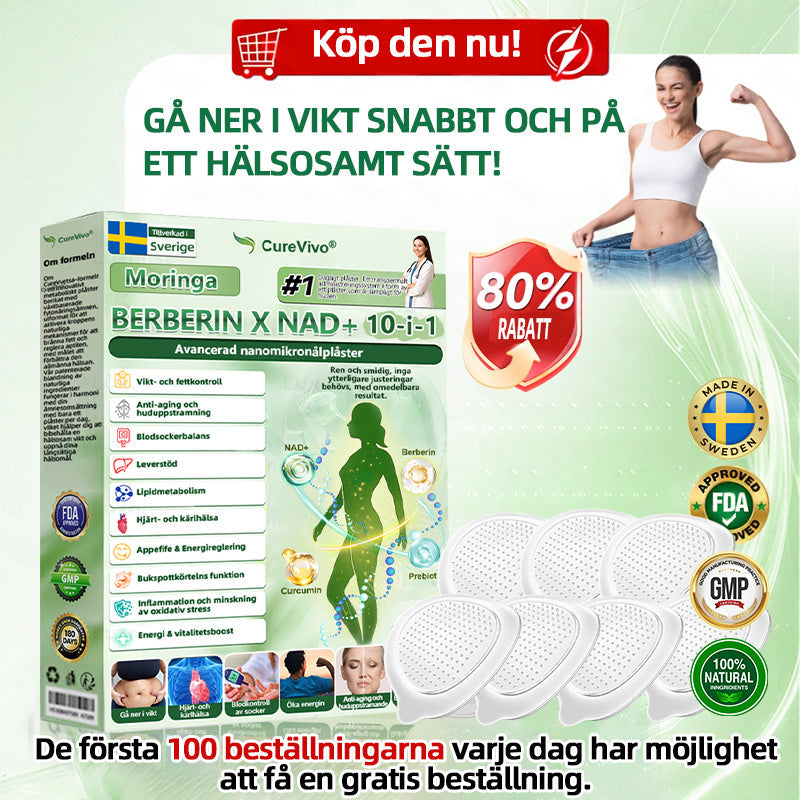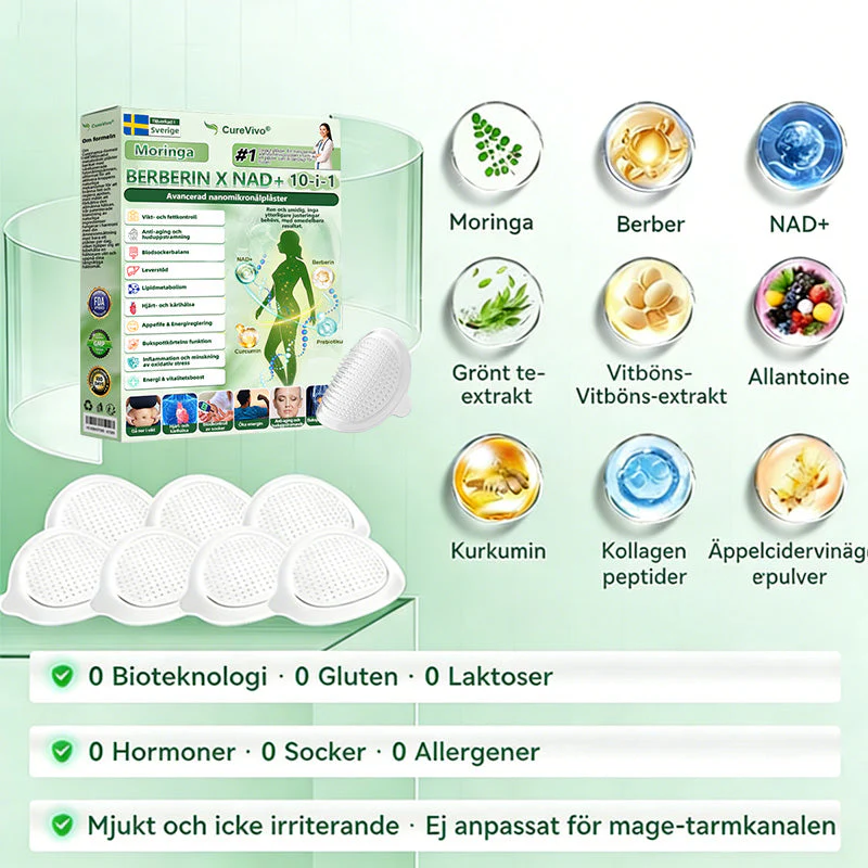 The 𝐂𝐮𝐫𝐞𝐕𝐢𝐯𝐨® 𝐌𝐨𝐫𝐢𝐧𝐠𝐚 𝐁𝐄𝐑𝐁𝐄𝐑𝐈𝐍 𝐗 𝐍𝐀𝐃+𝟏𝟎-𝐢-𝟏 𝐀𝐯𝐚𝐧𝐜𝐞𝐫𝐚𝐝 nanoneedle patch was developed through more than 20 years of research by a multidisciplinary team of over 30 experts . Each patch contains an ultra-fine microneedle architecture measuring approximately one-seventh the thickness of a human hair , designed to ensure smooth and virtually painless application. The formula contains highly concentrated natural bioactive compounds, up to 20 times higher than conventional market levels , including Moringa and Berberine , which work synergistically to support healthy glycemic responses, appetite regulation and lipid metabolism, promoting gradual and sustainable weight management . Enriched with NAD+, the patch further supports skin firmness and structural resilience during weight fluctuations , helping to maintain a slim appearance without compromising comfort or aesthetics. Additional highly effective components help support immune function, digestive health, gut balance, women’s health, daily energy levels and reduced fatigue , which together promote a more youthful and resilient physiological state from within. This product meets the quality standards of the Swedish Health Discussion Organization and does not require injections. Based on scientific principles, it provides a safe and comprehensive approach to effectively control weight and promote long-term metabolic health, designed to work in harmony with the body rather than against it .